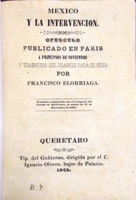 MEXICO Y LA INTERVENCION. OPUSCULO PUBLICADO EN PARIS A PRINCIPIOS DE NOVIEMBRE Y TRADUDUCIDO DEL FRANCES PARA EL SIGLO POR FRANCISCO ELORRIAGA. MANDADO REIMPRIMIR POR EL CONGRESO DEL ESTADO DE QUERETARO, EN SESION DE 27 DE DICIEMBRE DE 1861
