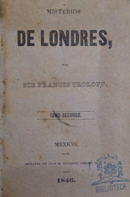 AUTOR: TROLOPP (FRANCIS)EDITOR: IMPRENTA DE JUAN R. NAVARROEDICIÓN: S. E.AÑO: 1846LUGAR: S. L.PAÍS: MEXICOPÁGINAS: 522 PP. MAS INDICETEMARIO: ANTIGUO. LITERATURAID: 56.A