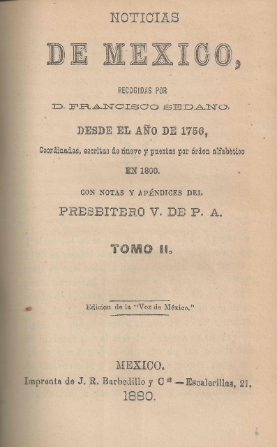 NOTICIAS DE MEXICO, RECOGIDAS POR D. FRANCISCO SEDANO, VECINO DE ESTA CIUDAD DESDE EL AÑO DE 1756, COORDINADAS, ESCRITAS DE NUEVO Y PUESTAS POR ORDEN ALFABETICO EN 1800. CON NOTAS Y APENDICES DEL PRESBITERO V. DE P. A. TOMO II