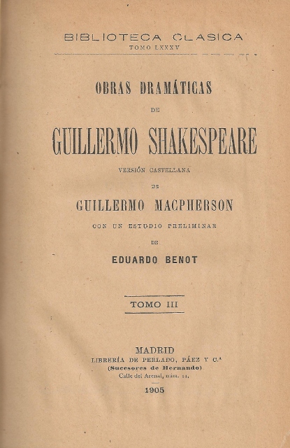 AUTOR: SHAKESPEARE (GUILLERMO)EDITOR: IMP. DE PERLADO, PAEZ Y C.EDICIÓN: S. E.AÑO: 1905LUGAR: MADRIDPAÍS: S. P.PÁGINAS: 416 PP.TEMARIO: ANTIGUO. LITERATURAID: 4462.009