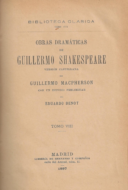 AUTOR: SHAKESPEARE (GUILLERMO)EDITOR: IMPRENTA DE HERNANDO Y COMPAÑIAEDICIÓN: S. E.AÑO: 1897LUGAR: MADRIDPAÍS: S. P.PÁGINAS: 392 PP.TEMARIO: ANTIGUO. LITERATURAID: 4462.014