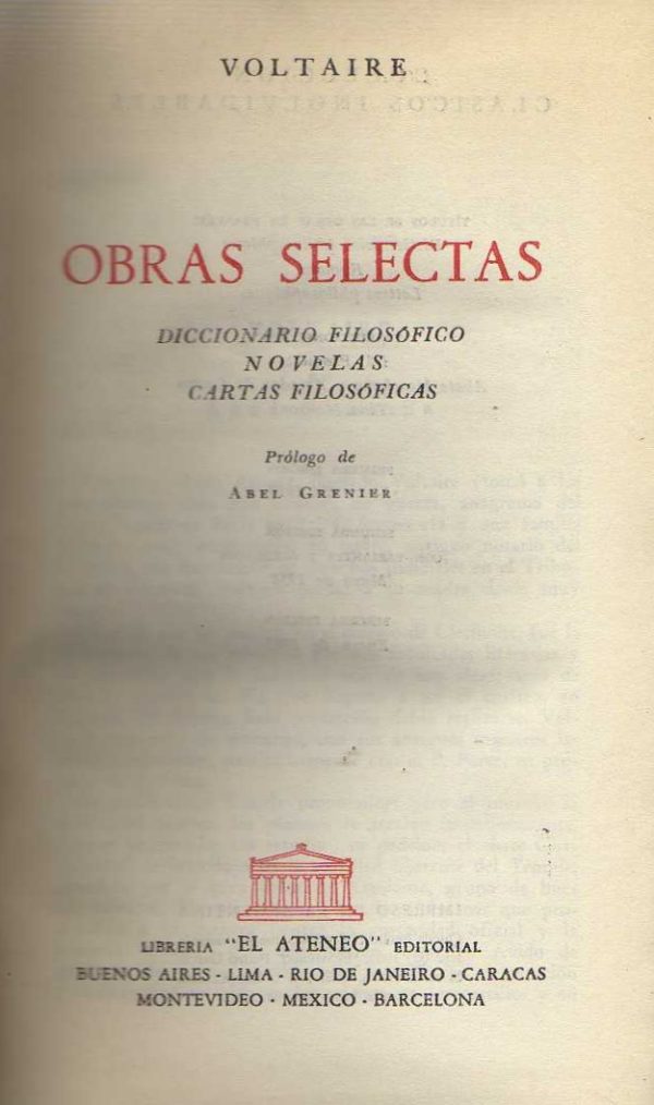 AUTOR: VOLTAIREEDITOR: LIBRERIA EL ATENEOEDICIÓN: TERCERA EDICIONAÑO: 1965LUGAR: BUENOS AIRESPAÍS: ARGENTINAPÁGINAS: 1005 PP.TEMARIO: LITERATURA MUNDIALID: M914
