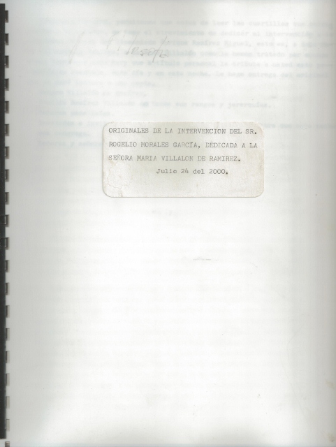 ORIGINAL DE LA INTERVENCION DEL SR. ROGELIO MORALES GARCIA, DEDICADA A LA SEÑORA MARIA VILLALON DE RAMIREZ. JULIO 24 DEL 2000