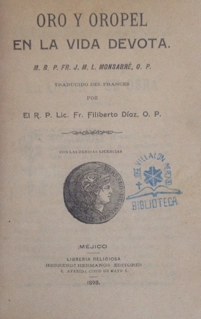 ORO Y OROPEL EN LA VIDA DEVOTA. M. R. P. FR. J. M. L. MONSABRE, O. P. TRADUCIDO DEL FRANCES POR EL R. P. LIC. FILIBERTO DIAZ, O. P