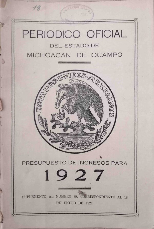 PERIODICO OFICIAL DEL ESTADO DE MICHOACAN DE OCAMPO. PRESUPUESTO DE INGRESOS PARA 1927. SUPLEMENTO AL NUMERO 39, CORRESPONDIENTE AL 16 DE ENERO DE 1927
