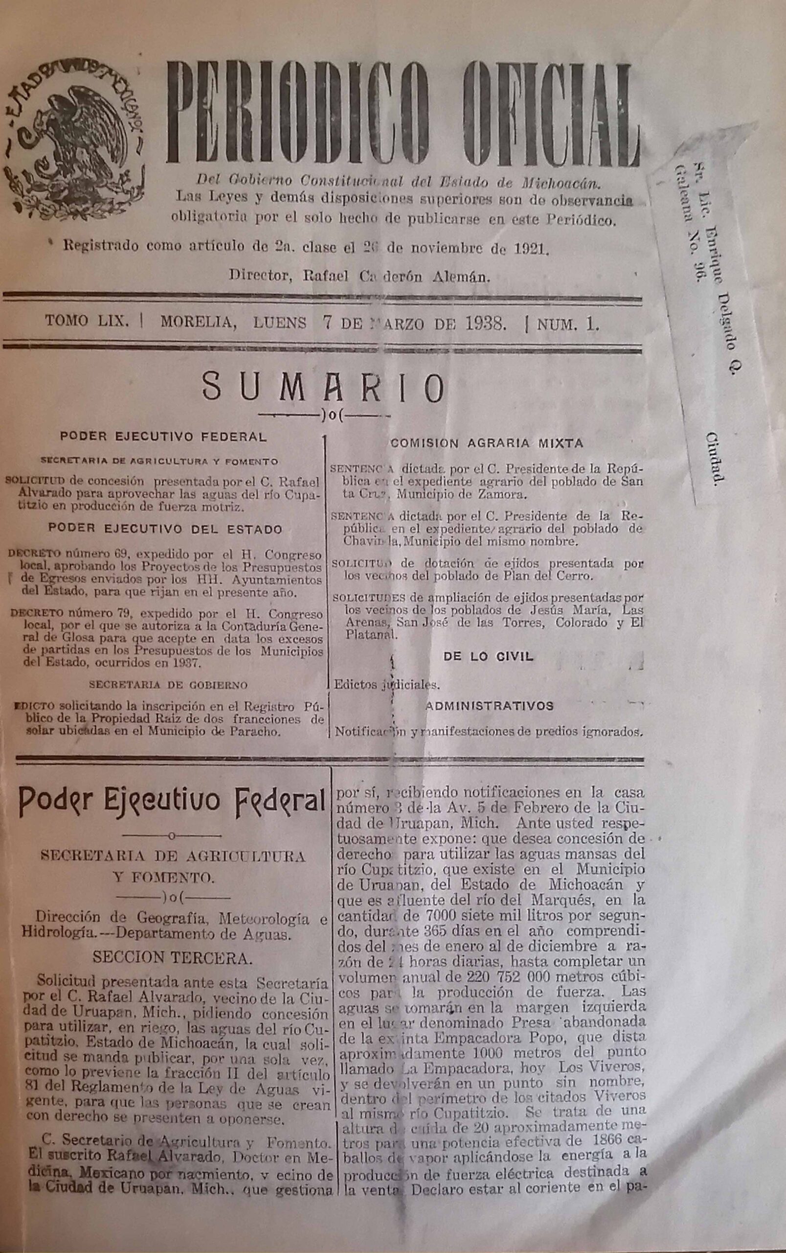 PERIODICO OFICIAL DEL ESTADO DE MICHOACAN DE OCAMPO. TOMO LIX. 7 DE MARZO DE 1938. No. 1 AL 100. TOMO LVIII(LIX). 3 MARZO DE 1938 (1939).