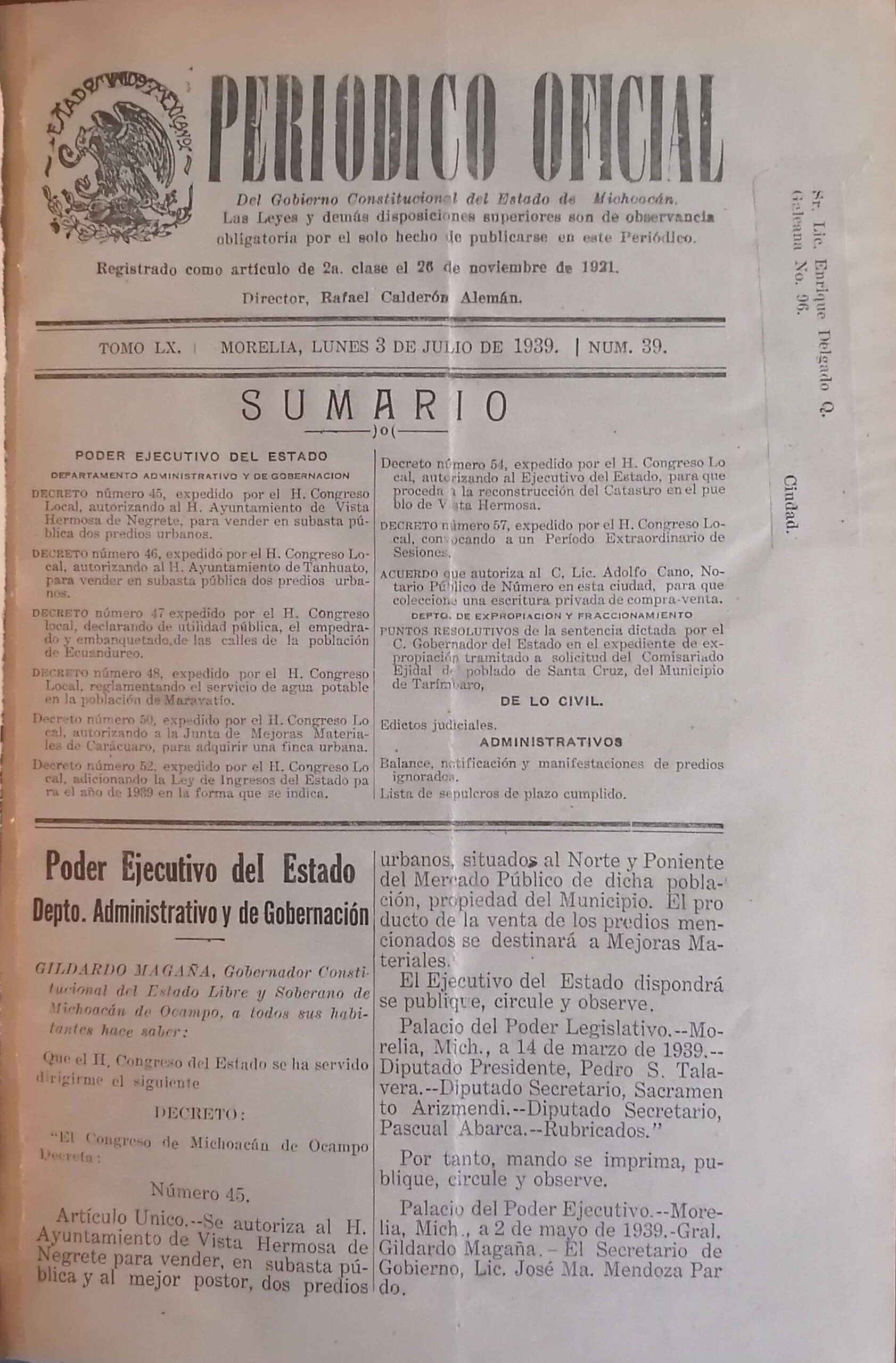 PERIODICO OFICIAL DEL ESTADO DE MICHOACAN DE OCAMPO. TOMO LX. 3 DE JULIO DE 1939. No. 39 AL 90. TOMO LX. 28 DICIEMBRE DE 1939.