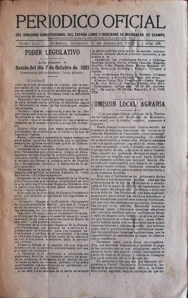 PERIODICO OFICIAL DEL ESTADO DE MICHOACAN DE OCAMPO. TOMO XLII. 1 DE ENERO DE 1922. No. 28 AL 32. TOMO XLIII. 31 DICIEMBRE DE 1922.