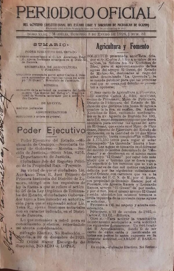 PERIODICO OFICIAL DEL ESTADO DE MICHOACAN DE OCAMPO. TOMO XLVI. 3 DE ENERO DE 1926. No. 31 AL 81. TOMO XLVI. 27 DE JUNIO DE 1926.