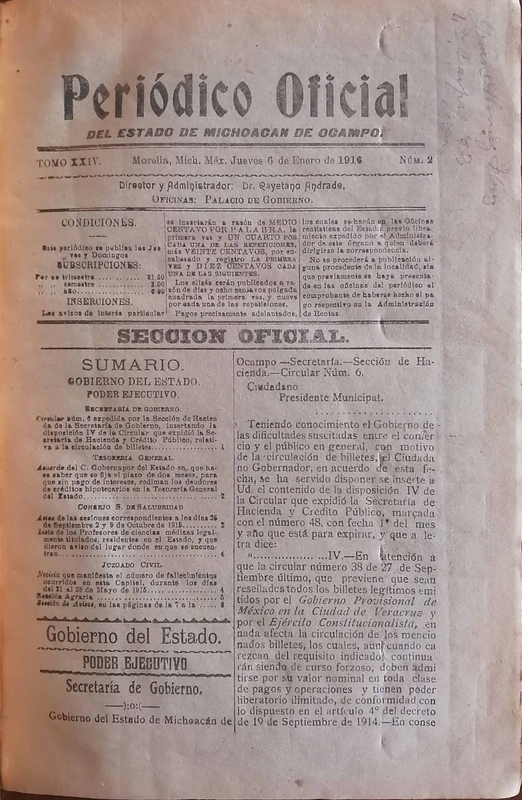 PERIODICO OFICIAL DEL ESTADO DE MICHOACAN DE OCAMPO. TOMO XXIV. 6 DE ENERO DE 1916. No. 2 AL 102. 21 DICIEMBRE DE 1916.