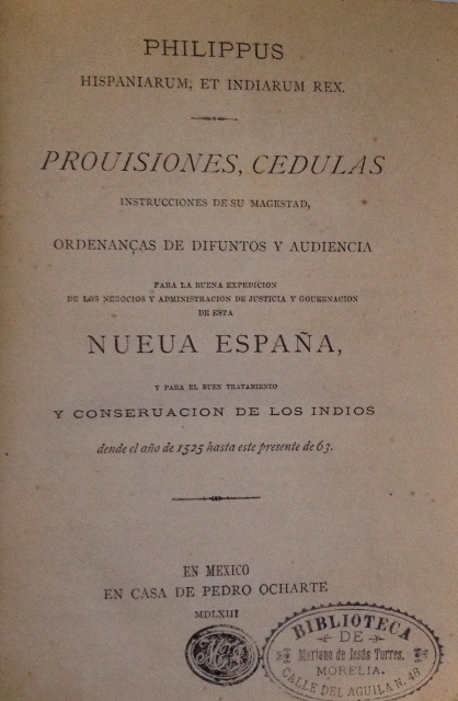 PHILIPPUS HISPANIARUM, ET INDIARUM REX. PROVISIONES, CEDULAS, INSTRUCCIONES DE SU MAGESTAD, ORDENANCAS DE DIFUNTOS Y AUDIENCIA PARA LA BUENA EXPEDICION DE LOS NEGOCIOS Y ADMINISTRACION DE JUSTICIA Y GOVERNACION DE ESTA NUEVA ESPAÑA, Y PARA EL BUEN TRATAMIENTO Y CONSERVACION DE LOS INDIOS. DENDE EL AÑO DE 1525 HASTA ESTE PRESENTE DE 63. TOMO I