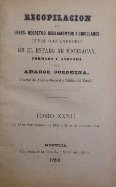 RECOPILACION DE LEYES, DECRETOS, REGLAMENTOS Y CIRCULARES QUE SE HAN EXPEDIDO EN EL ESTADO DE MICHOACAN. TOMO XXXII. DE 22 DE SEPTIEMBRE DE 1892 A 31 DE AGOSTO DE 1894.