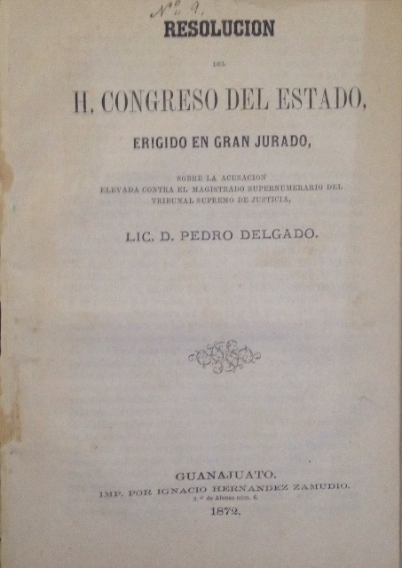 RESOLUCION DEL H. CONGRESO DEL ESTADO, ERIGIDO EN GRAN JURADO, SOBRE LA ACUSACION ELEVADA CONTRA EL MAGISTRADO SUPERNUMERARIO DEL TRIBUNAL SUPREMO DE JUSTICIA, LIC. D. PEDRO DELGADO