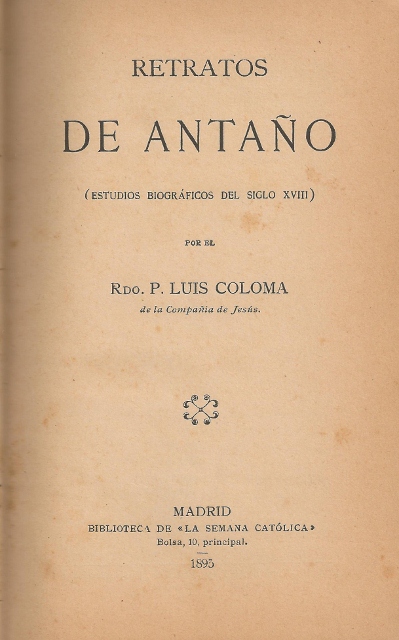 RETRATOS DE ANTAÑO (ESTUDIOS BIOGRAFICOS DEL SIGLO XVIII) POR EL PDO. LUIS COLOMA DE LA COMPAÑIA DE JESUS
