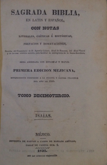 SAGRADA BIBLIA, EN LATIN Y ESPAÑOL, CON NOTAS LITERALES, CRITICAS E HISTORICAS, PREFACIOS Y DISERTACIONES, SACADAS DEL COMENTARIO DE D. AGUSTIN CALMET, ABAD DE SENONES, DEL ABAD VENCE Y DE LOS MAS CELEBRES AUTORES, PARA FACILITAR LA INTELIGENCIA DE LA SANTA ESCRITURA. OBRA ADORNADA CON ESTAMPAS Y MAPAS. TOMO DECIMOTERCERO. ISAIAS