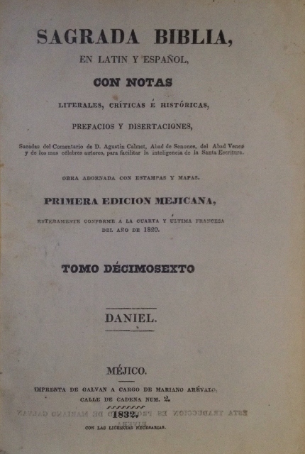 SAGRADA BIBLIA, EN LATIN Y ESPAÑOL, CON NOTAS LITERALES, CRITICAS E HISTORICAS, PREFACIOS Y DISERTACIONES, SACADAS DEL COMENTARIO DE D. AGUSTIN CALMET, ABAD DE SENONES, DEL ABAD VENCE Y DE LOS MAS CELEBRES AUTORES, PARA FACILITAR LA INTELIGENCIA DE LA SANTA ESCRITURA. OBRA ADORNADA CON ESTAMPAS Y MAPAS. TOMO DECIMOSEXTO. DANIEL