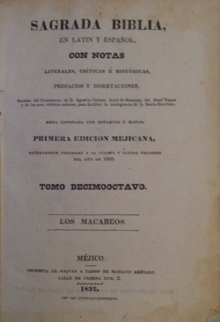 SAGRADA BIBLIA, EN LATIN Y ESPAÑOL, CON NOTAS LITERALES, CRITICAS E HISTORICAS, PREFACIOS Y DISERTACIONES, SACADAS DEL COMENTARIO DE D. AGUSTIN CALMET, ABAD DE SENONES, DEL ABAD VENCE Y DE LOS MAS CELEBRES AUTORES, PARA FACILITAR LA INTELIGENCIA DE LA SANTA ESCRITURA. OBRA ADORNADA CON ESTAMPAS Y MAPAS. TOMO DECIMOOCTAVO. LOS MACABEOS