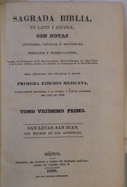 SAGRADA BIBLIA, EN LATIN Y ESPAÑOL, CON NOTAS LITERALES, CRITICAS E HISTORICAS, PREFACIOS Y DISERTACIONES, SACADAS DEL COMENTARIO DE D. AGUSTIN CALMET, ABAD DE SENONES, DEL ABAD VENCE Y DE LOS MAS CELEBRES AUTORES, PARA FACILITAR LA INTELIGENCIA DE LA SANTA ESCRITURA. OBRA ADORNADA CON ESTAMPAS Y MAPAS. TOMO VIGESIMO PRIMO. SAN LUCAS, SAN JUAN, LOS HECHOS DE LOS APOSTOLES