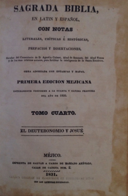 SAGRADA BIBLIA, EN LATIN Y ESPAÑOL, CON NOTAS LITERALES, CRITICAS E HISTORICAS, PREFACIOS Y DISERTACIONES, SACADAS DEL COMENTARIO DE D. AGUSTIN CALMET, ABAD DE SENONES, DEL ABAD VENCE Y DE LOS MAS CELEBRES AUTORES, PARA FACILITAR LA INTELIGENCIA DE LA SANTA ESCRITURA. OBRA ADORNADA CON ESTAMPAS Y MAPAS. TOMO CUARTO. EL DEUTERONOMIO Y JOSUE