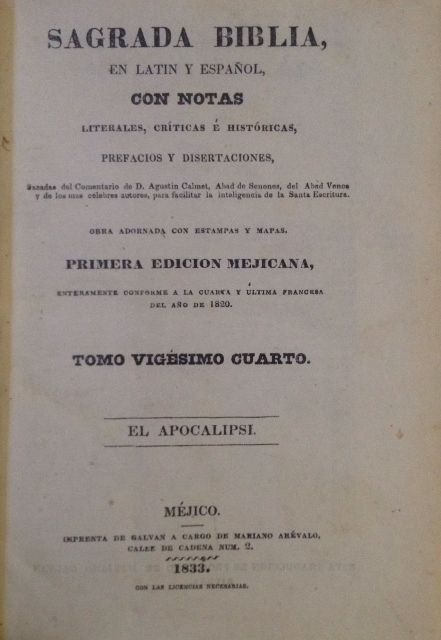SAGRADA BIBLIA, EN LATIN Y ESPAÑOL, CON NOTAS LITERALES, CRITICAS E HISTORICAS, PREFACIOS Y DISERTACIONES, SACADAS DEL COMENTARIO DE D. AGUSTIN CALMET, ABAD DE SENONES, DEL ABAD VENCE Y DE LOS MAS CELEBRES AUTORES, PARA FACILITAR LA INTELIGENCIA DE LA SANTA ESCRITURA. OBRA ADORNADA CON ESTAMPAS Y MAPAS. TOMO VIGESIMO CUARTO. EL APOCALIPSIS