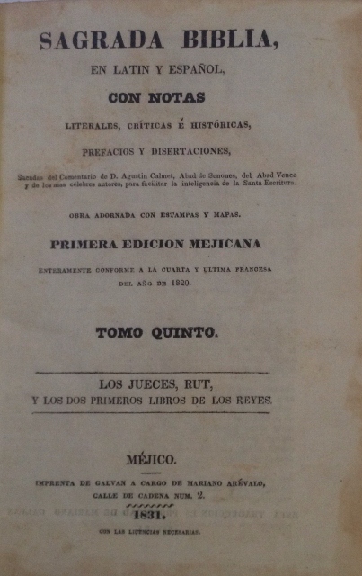 SAGRADA BIBLIA, EN LATIN Y ESPAÑOL, CON NOTAS LITERALES, CRITICAS E HISTORICAS, PREFACIOS Y DISERTACIONES, SACADAS DEL COMENTARIO DE D. AGUSTIN CALMET, ABAD DE SENONES, DEL ABAD VENCE Y DE LOS MAS CELEBRES AUTORES, PARA FACILITAR LA INTELIGENCIA DE LA SANTA ESCRITURA. OBRA ADORNADA CON ESTAMPAS Y MAPAS. TOMO QUINTO. LOS JUECES, RUT, Y LOS DOS PRIMEROS LIBROSDE LOS REYES
