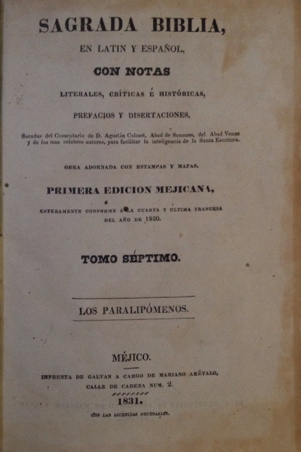SAGRADA BIBLIA, EN LATIN Y ESPAÑOL, CON NOTAS LITERALES, CRITICAS E HISTORICAS, PREFACIOS Y DISERTACIONES, SACADAS DEL COMENTARIO DE D. AGUSTIN CALMET, ABAD DE SENONES, DEL ABAD VENCE Y DE LOS MAS CELEBRES AUTORES, PARA FACILITAR LA INTELIGENCIA DE LA SANTA ESCRITURA. OBRA ADORNADA CON ESTAMPAS Y MAPAS. TOMO SEPTIMO. LOS PARALIPOMENOS