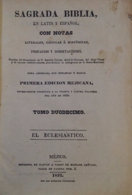 SAGRADA BIBLIA, EN LATIN Y ESPAÑOL, CON NOTAS LITERALES, CRITICAS E HISTORICAS, PREFACIOS Y DISERTACIONES, SACADAS DEL COMENTARIO DE D. AGUSTIN CALMET, ABAD DE SENONES, DEL ABAD VENCE Y DE LOS MAS CELEBRES AUTORES, PARA FACILITAR LA INTELIGENCIA DE LA SANTA ESCRITURA. OBRA ADORNADA CON ESTAMPAS Y MAPAS. TOMO DUODECIMO. EL ECLESIASTICO