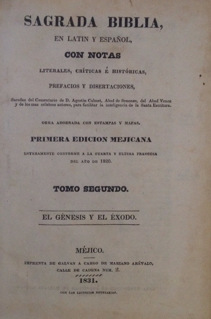 SAGRADA BIBLIA, EN LATIN Y ESPAÑOL, CON NOTAS LITERALES, CRITICAS E HISTORICAS, PREFACIOS Y DISERTACIONES,SACADAS DEL COMENTARIO DE D. AGUSTIN CALMET, ABAD DE SENONES, DEL ABAD VENCE Y DE LOS MAS CELEBRES AUTORES, PARA FACILITAR LA INTELIGENCIA DE LA SANTA ESCRITURA. OBRA ADORNADA CON ESTAMPAS Y MAPAS. TOMO SEGUNDO. EL GENESIS Y EL EXODO