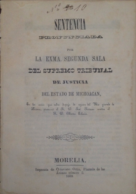 SENTENCIA PRONUNCIADA POR LA EXMA. SEGUNDA SALA DEL SUPREMO TRIBUNAL DE JUSTICIA DEL ESTADO DE MICHOACAN, EN LOS AUTOS QUE SOBRE DESPOJO DE AGUAS DEL RIO GRANDE DE LERMA, PROMOVIO EL SR. D. JOSE SERRANO CONTRA EL SR. D. MATEO ECHAIZ