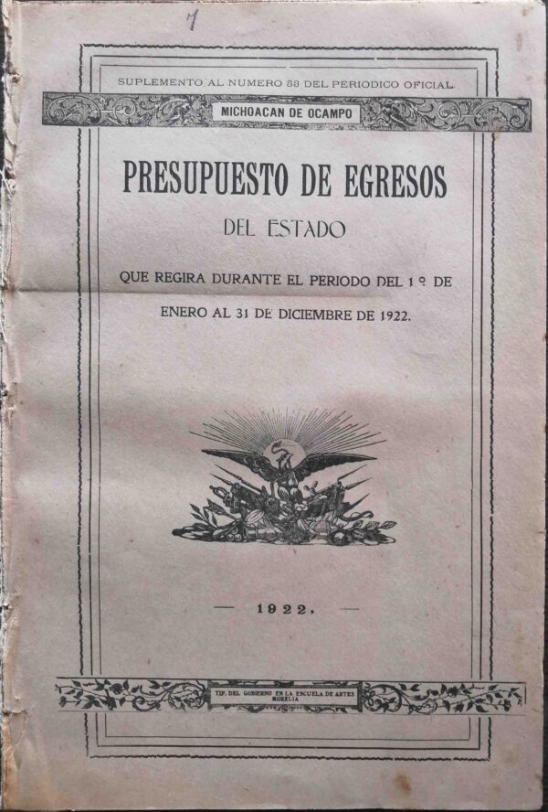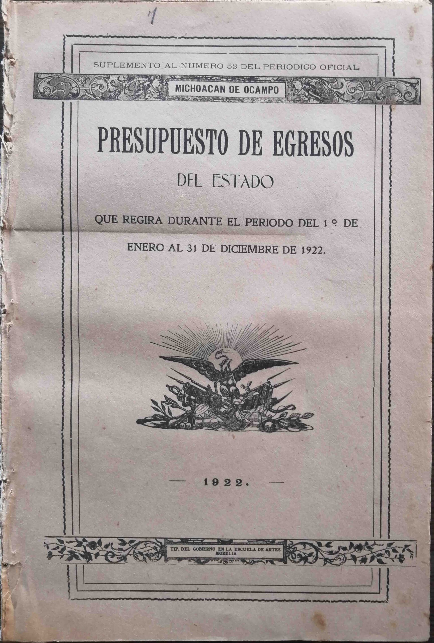 SUPLEMENTO AL NUMERO 53 DEL PERIODICO OFICIAL. MICHOACAN DE OCAMPO. PRESUPUESTO DE EGRESOS DEL ESTADO QUE REGIRA DURANTE EL PERIODO DEL 1° DE ENERO AL 31 DE DICIEMBRE DE 1922