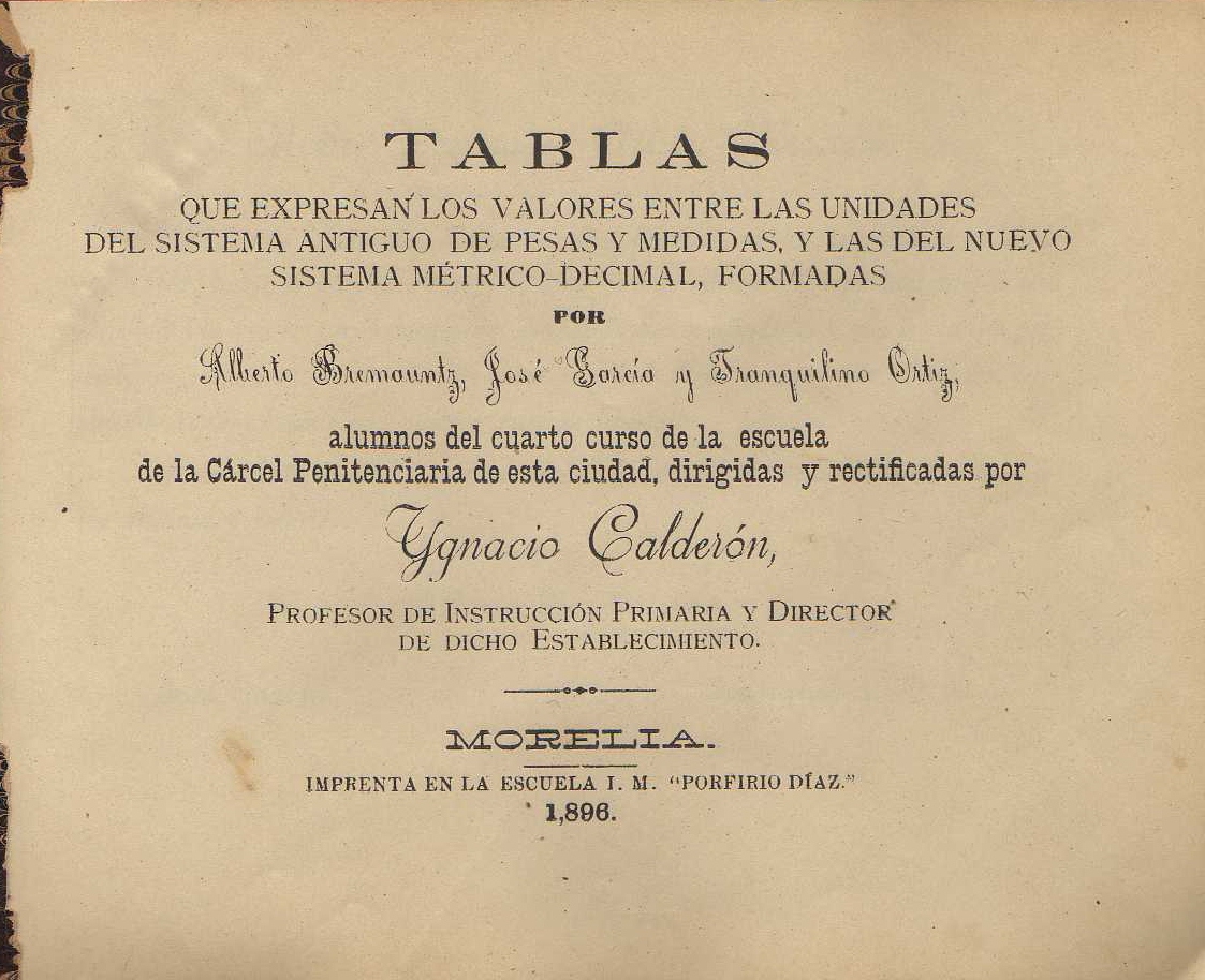 TABLAS QUE EXPRESAN LOS VALORES ENTRE LAS UNIDADES DEL SISTEMA ANTIGUO DE PESAS Y MEDIDAS, Y LAS DEL NUEVO SISTEMA METRICO DECIMAL, FORMADAS. ALBERTO BREMOUNTZ, JOSE GARCIA Y TRANQUILINO ORTIZ. ALUMNOS DEL CUARTO CURSO DE LA ESCUELA DE LA CARCEL PENITENCIARIA DE ESTA CIUDAD, DIRIGIDAS Y RECTIFICADAS POR YGNACIO CALDERON