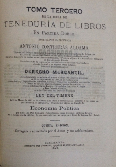TENEDURIA DE LIBROS EN PARTIDA DOBLE. ESCRITA POR EL PROFESOR ANTONIO CONTRERAS ALDAMA. CONTIENE PRINCIPALMENTE EL DRECHO MERCANTIL. CUIDADOSAMNTE ARREGLADO AL NUEVO CODIGO DE COMERCIO PUBLICADO EN 15 DE SEPTIEMBRE DE 1889. TOMO III