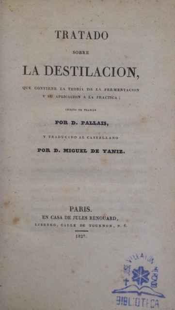 TRATADO SOBRE LA DESTILACION, QUE CONTIENE LA TEORIA DE LA FERMENTACION Y SU APLICACION A LA PRACTICA; ESCRITO EN FRANCES POR D. PALLAIS, Y TRADUCCION AL CASTELLANO POR D. MANUEL DE YANIZ