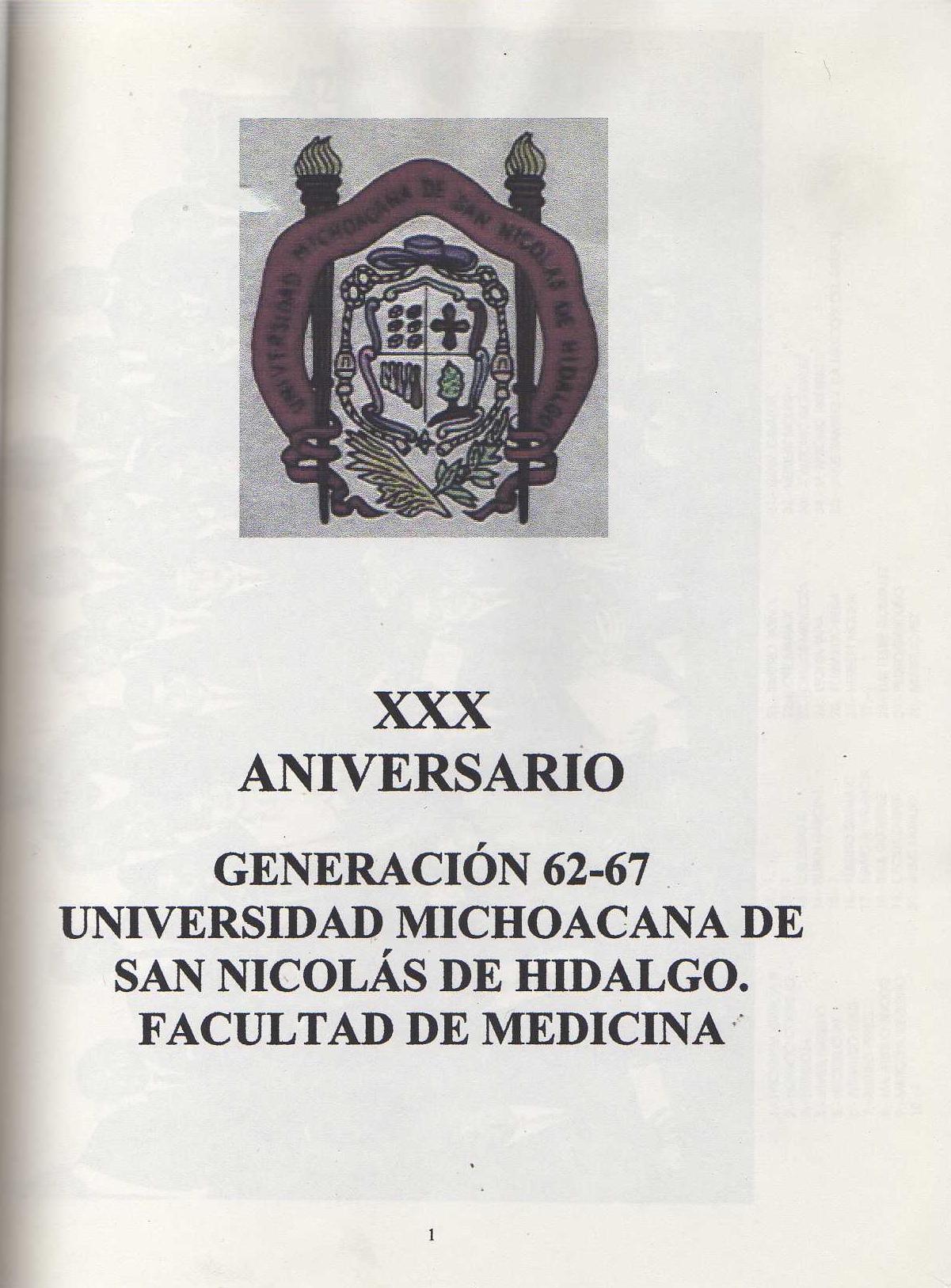 TREINTA XXX ANIVERSARIO GENERACION 62-67 UNIVERSIDAD MICHOACANA DE SAN NICOLAS DE HIDALGO. FACULTAD DE MEDICINA