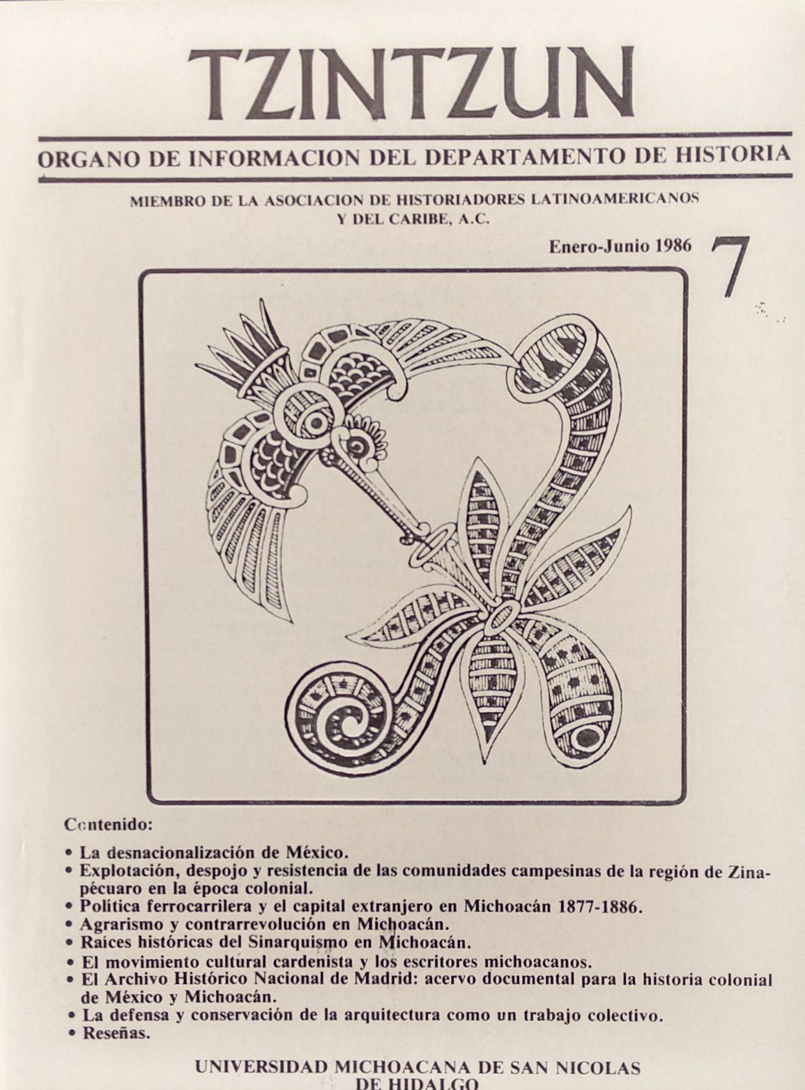 TZINTZUN. ORGANO DE INFORMACION DEL DEPARTAMENTO DE HISTORI. MIEMBRO DE LA ASOCIACION DE HISTORIADORES LATINOAMERICANOS Y DEL CARIBE. TZINTZUN. REVISTA DE ESTUDIOS HISTORICOS. ENERO-JUNIO 1986. N° 7