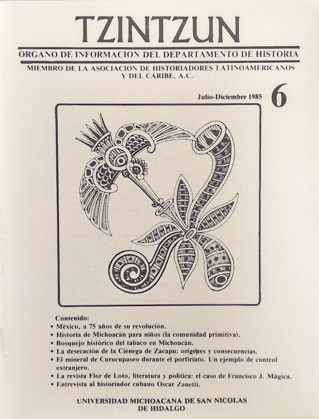 TZINTZUN. ORGANO DE INFORMACION DEL DEPARTAMENTO DE HISTORI. MIEMBRO DE LA ASOCIACION DE HISTORIADORES LATINOAMERICANOS Y DEL CARIBE. TZINTZUN. REVISTA DE ESTUDIOS HISTORICOS. JULIO-DICIEMBRE 1985. N° 6