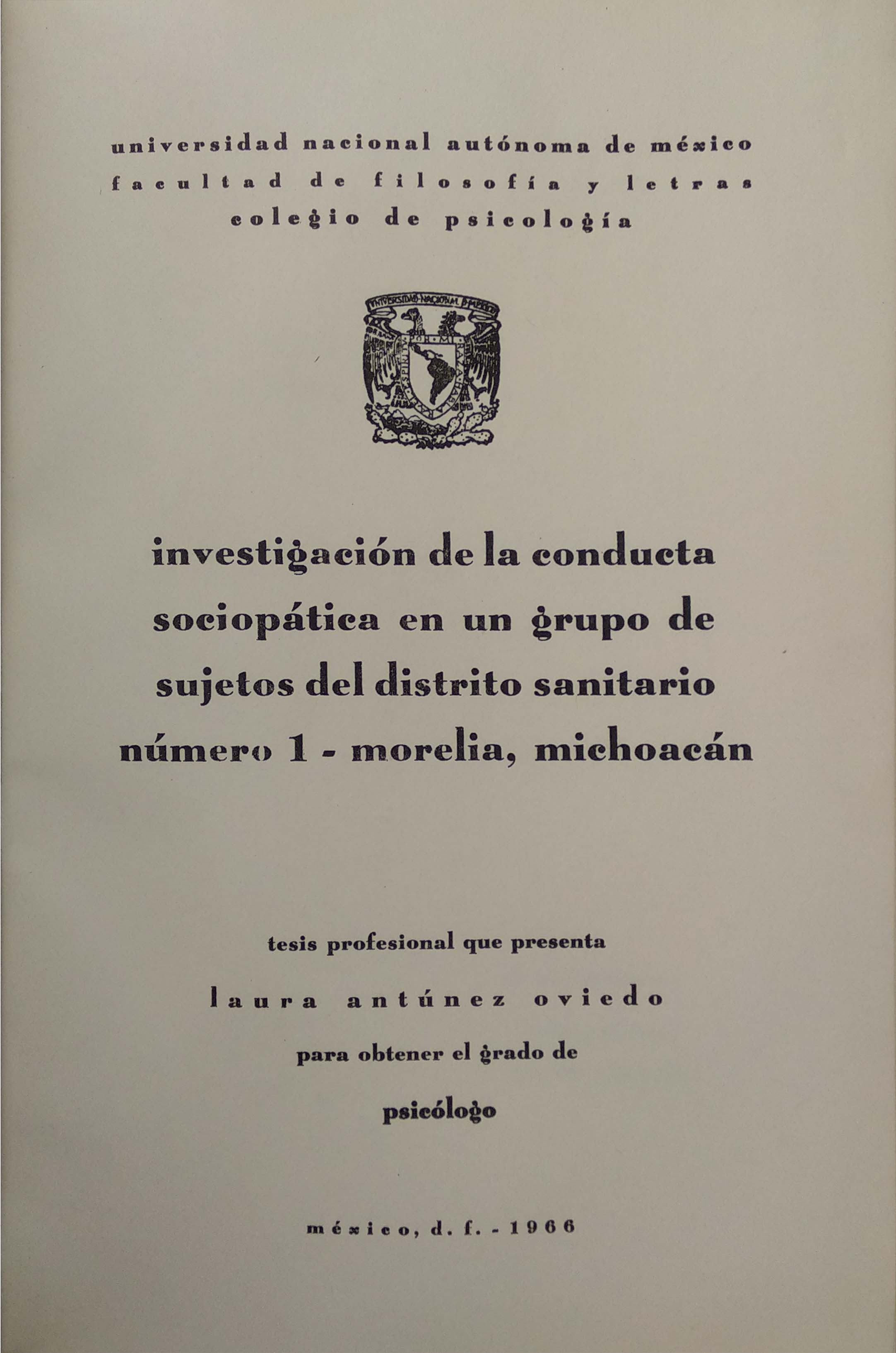 UNIVESIDAD NACIONAL AUTONOMA DE MEXICO. FACULTAD DE FILOSOFIA Y LETRAS. COLEGIO DE PSICOLOGIA. INVESTIGACION DE LA CONDUCTA SOCIOPATICA EN UN GRUPO DE SUJETOS DEL DISTRITO SANITARIO NUMERO 1 – MORELIA, MICHOACAN. TESIS PROFECIONAL QUE PRESENTA LAURA ANTUNEZ OVIEDO PARA OBTENER EL GRADO DE PSICOLOGO
